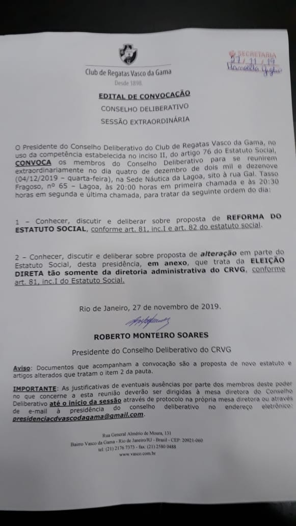 Roberto Monteiro convoca reunião do Conselho Deliberativo para o dia 04/12 para apreciar eleições diretas