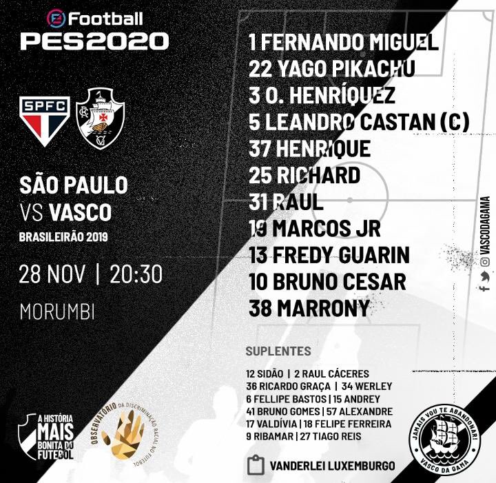 Vasco escalado com Bruno César no time titular #lanceMORUMBI