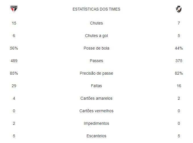 Cartões Amarelos: Tchê Tchê, Reinaldo, Luan e Juanfran (São Paulo); Marcos Júnior e Raul (Vasco)