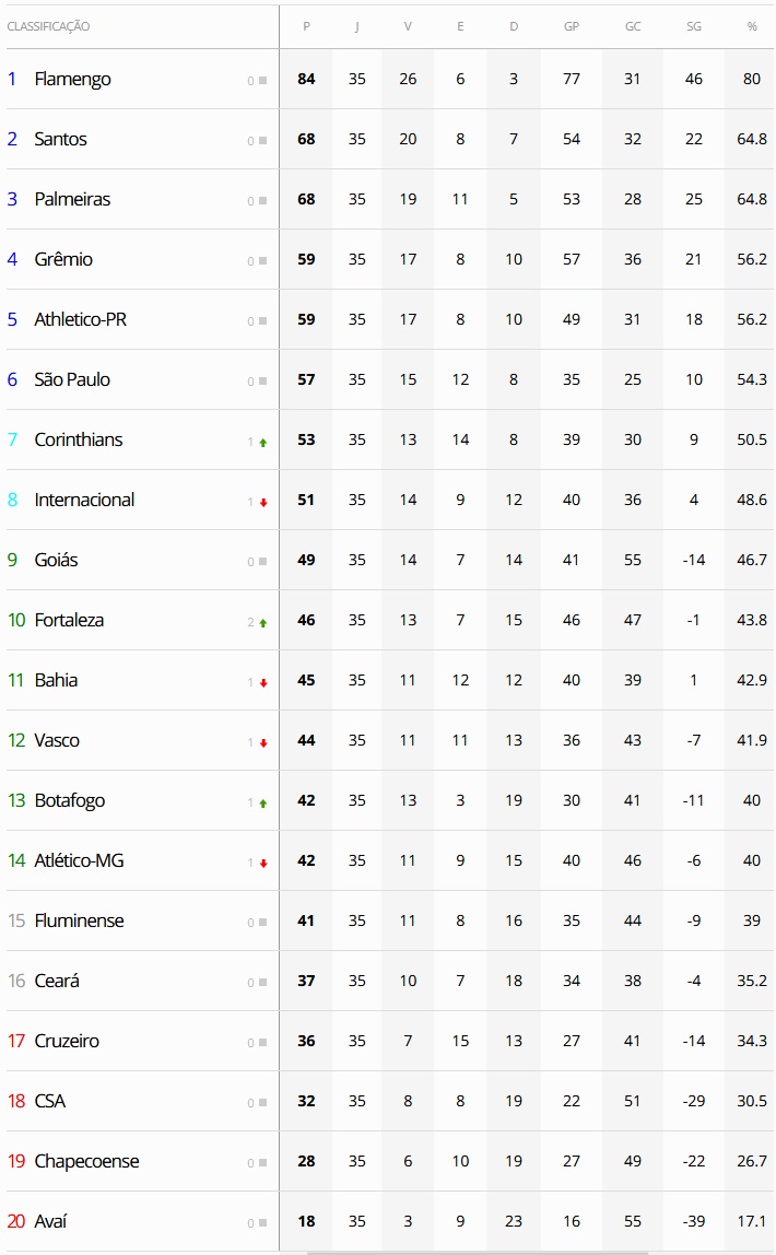 A 3 rodadas do fim do Brasileiro, o Vasco, que foi derrotado pelo São Paulo por 1 a 0, caiu da 11ª para a 12ª colocação, ficando a 7 pontos do G8 (o G6 "virou" G8 porque os campeões da Copa do Brasil e da Libertadores estão no G6) e a 8 pontos do Z4.