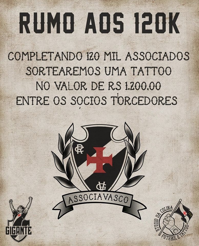 Studio da Colina sorteará tattoo no valor de R$ 1.200 caso o Vasco atinja 120 mil sócios