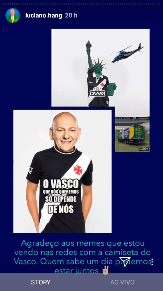 Em sua conta oficial no Instagram, Hang publicou um story agradecendo aos memes em que ele e a Estátua da Liberdade (símbolo da Havan) aparecem vestindo camisas do Vasco, criados pelos torcedores cruzmaltinos, e disse: "Quem sabe um dia podemos estar juntos".