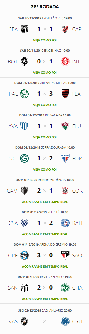Terminados os jogos de domingo da 36ª e antepenúltima rodada do Brasileiro, o Vasco caiu para o 13º lugar na classificação. O Gigante da Colina ainda tem chance matemática tanto de ir à Libertadores (