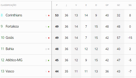 (Fortaleza e Goiás não podem empatar em pontos com o Vasco, pois ficariam à frente pelo número de vitórias.)