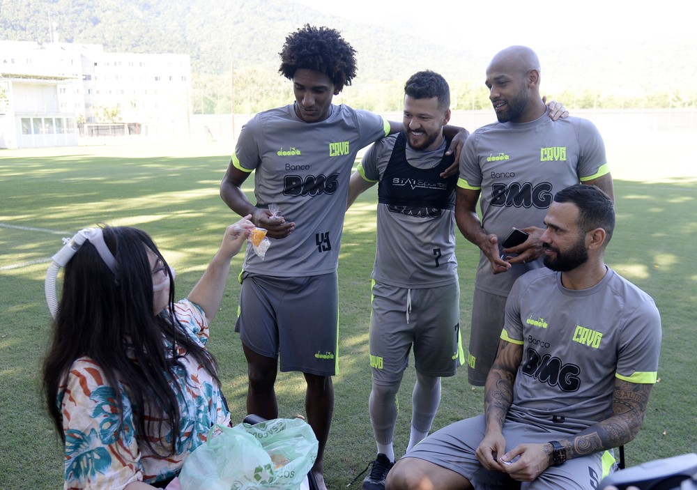 A surpresa, porém, aumentou. Pikachu, Rossi, Fellipe Bastos e Talles Magno se juntaram a Leandro Castan, fizeram uma verdadeira roda de resenha e ganharam presentes da Melissa, que avisou: "vocês vão me matar do coração". Ela levou suspiros embrulhados dois a dois e broches para os jogadores do Vasco.