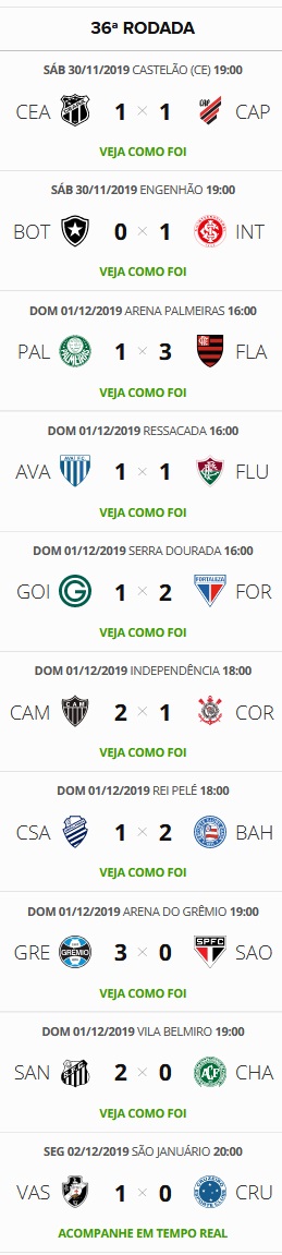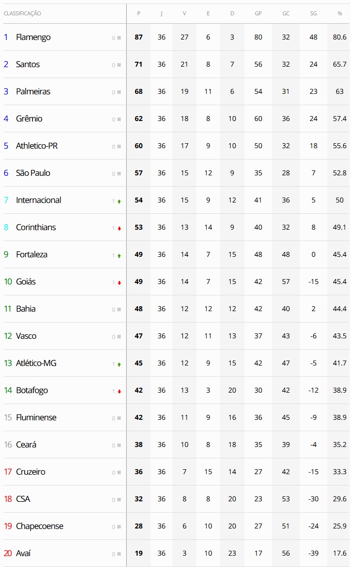 Terminada a 36ª e antepenúltima rodada do Brasileiro, o Vasco, que venceu o Cruzeiro por 1 a 0, segue em 12º lugar na tabela. O Gigante da Colina se livrou matematicamente do rebaixamento, está praticamente classificado para a Copa Sul-Americana e ainda tem chances, embora remotas, de ir à Libertadores.