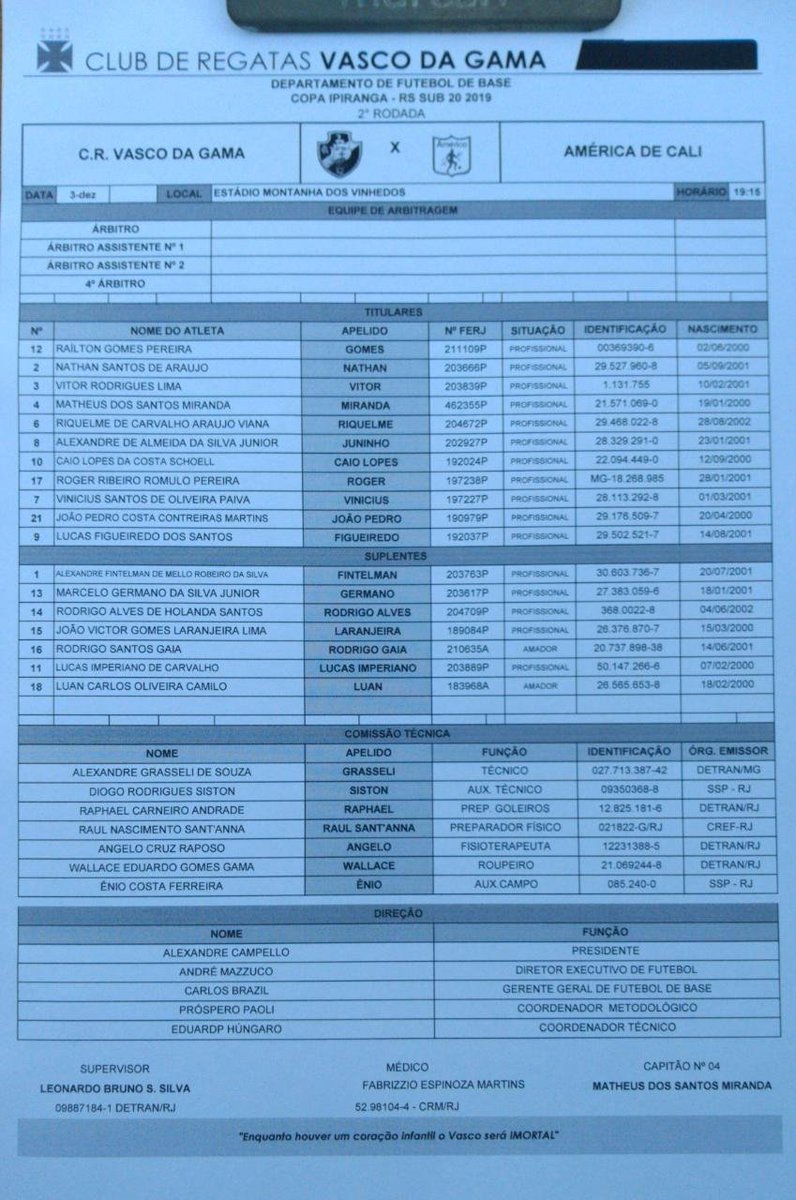 Vasco escalado para a 2ª rodada da Copa Ipiranga, contra o América de Cali, em Bento Gonçalves: Gomes; Nathan, Miranda, Vitor e Riquelme; Juninho, Caio Lopes e Roger; João Pedro, Vinicius Paiva e Figueiredo; Técnico: Alexandre Grasseli.