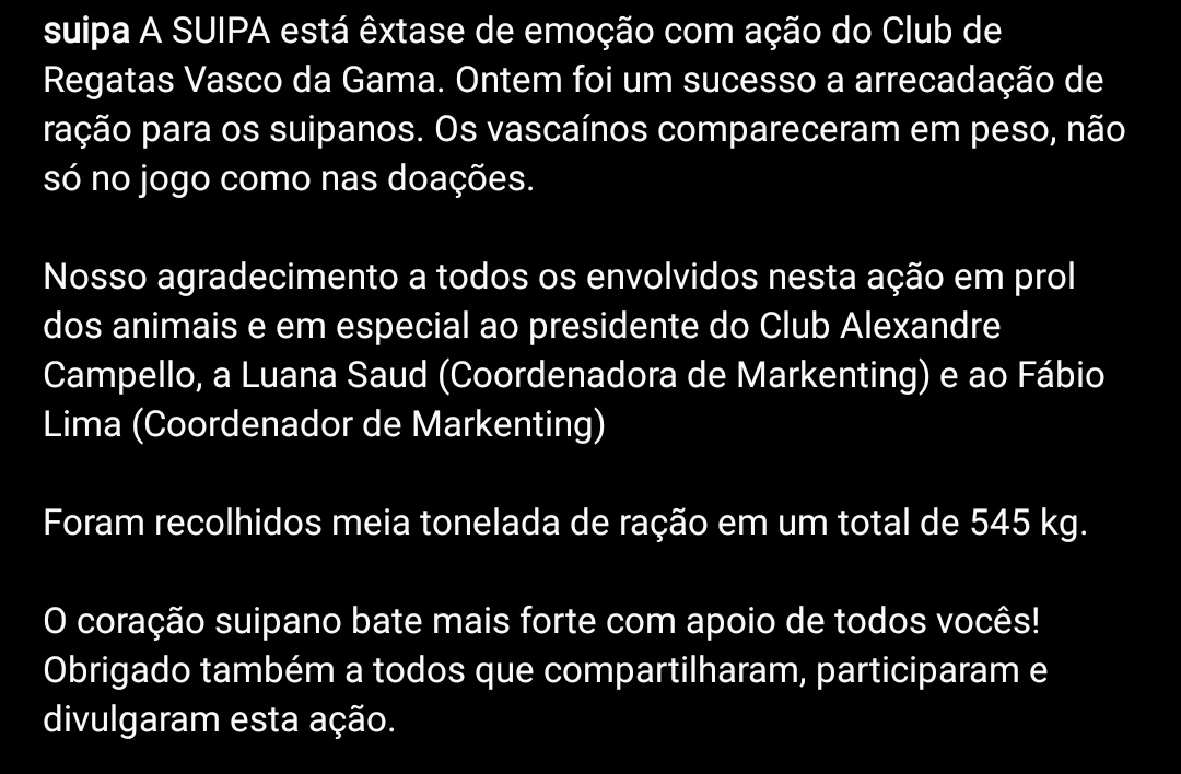 A ONG agradeceu aos vascaínos e todos os responsáveis pela ajuda.