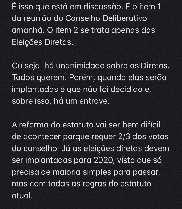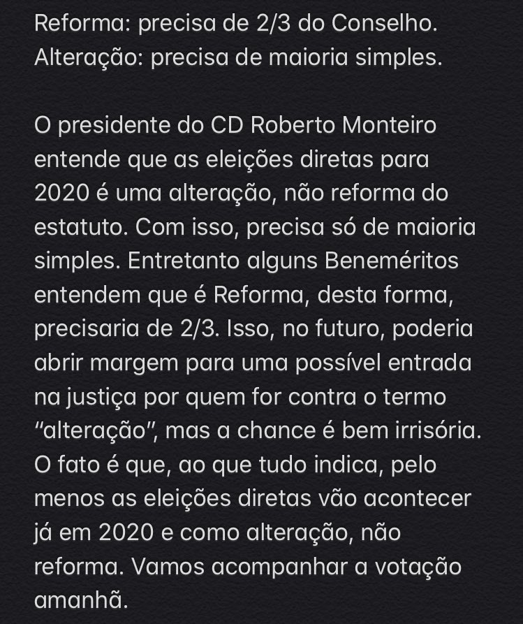 Apurei alguns pontos importantes sobre a reunião do Conselho Deliberativo que acontecerá na quarta (4) e vou explicar o que realmente será discutido sobre a reforma do estatuto e as eleições diretas, até aproveitando a última nota do Conselho de Beneméritos. Acompanhem as fotos: