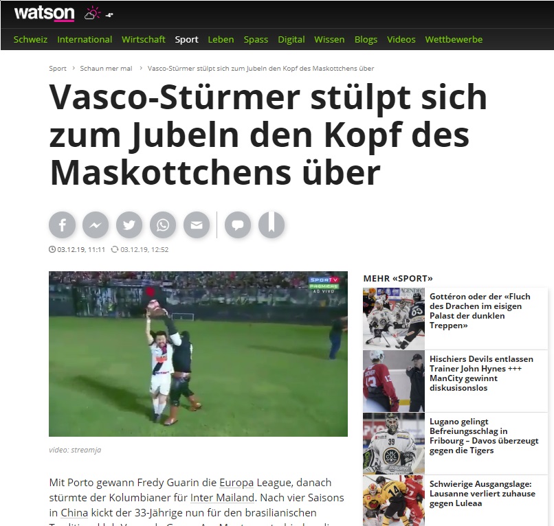 A inusitada comemoração de Rossi no gol de Guarín contra o Cruzeiro, na vitória vascaína por 1 a 0 na última 2ª-feira, repercutiu na imprensa da Europa. O site suíço "Watson" publicou o vídeo do jogador pegando a cabeça do mascote Almirante sob a manchete: "Artilheiro do Vasco põe a cabeça do mascote para comemorar".