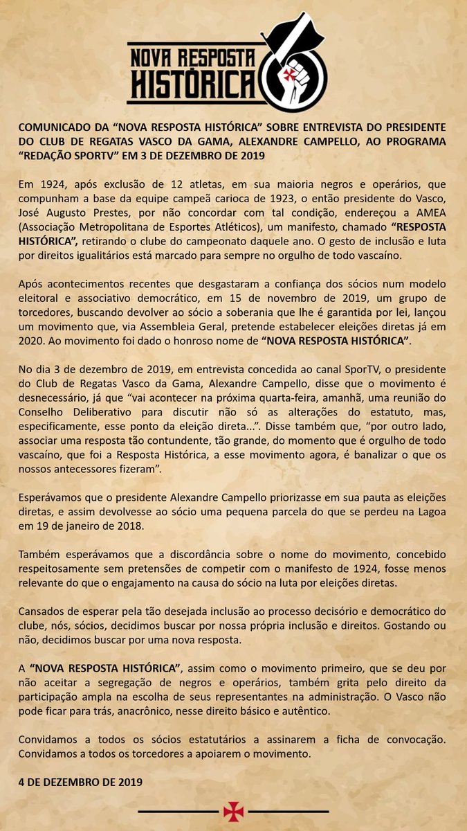 Comunicado da #NovaRespostaHistorica sobre entrevista do presidente @ascampello ao @SporTV