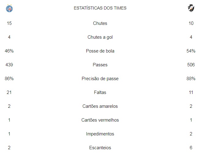Com 49 pontos, o Bahia permanece na 11ª colocação na tabela, enquanto o Vasco, com 48, caiu para a 13ª posição ao ser ultrapassado pelo Atlético-MG.