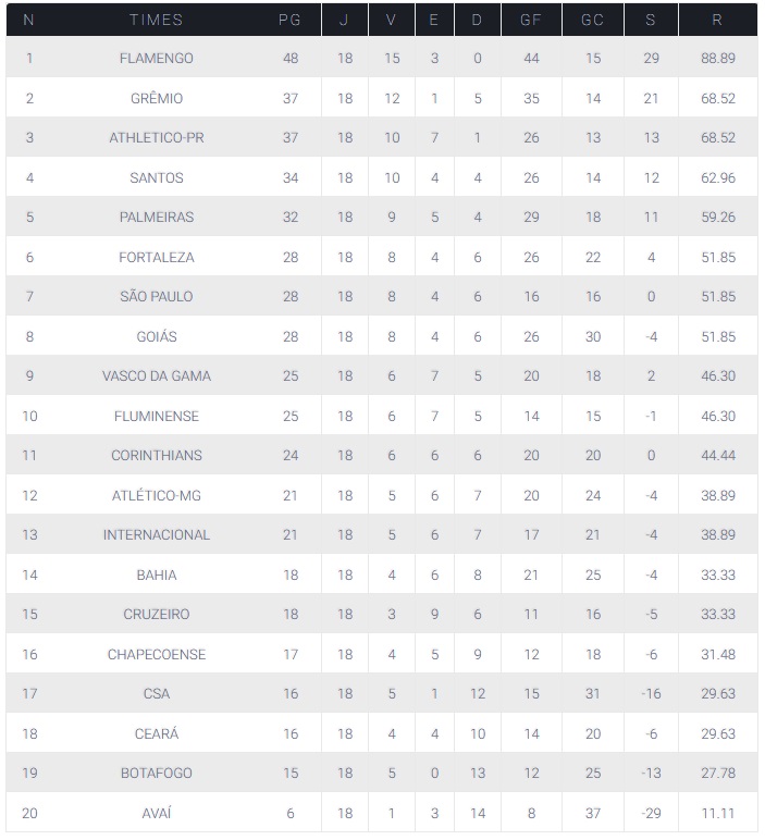 Com o empate por 1 a 1 contra o Bahia em Salvador, o Vasco se manteve na 9º posição na classificação do returno do Campeonato Brasileiro.