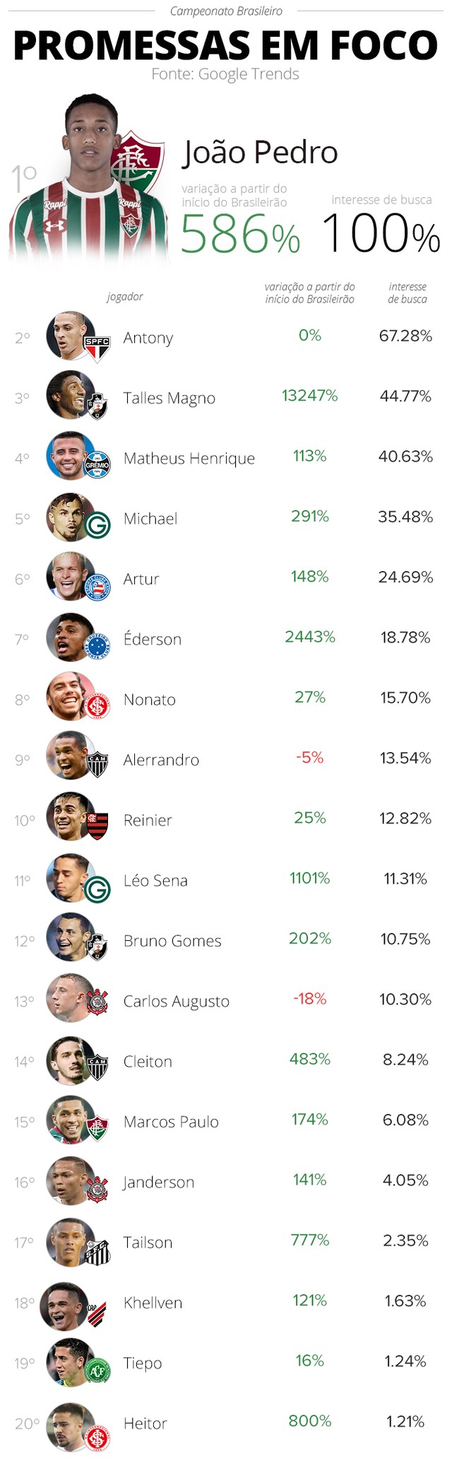 A lista abaixo está ordenada pelo interesse de busca dos jovens durante o período do Brasileirão, iniciado em 27 de abril. Coordenador do Google News Lab no Brasil, Marco Túlio Pires explicou o funcionamento do índice que colocou João Pedro, do Fluminense, em primeiro.