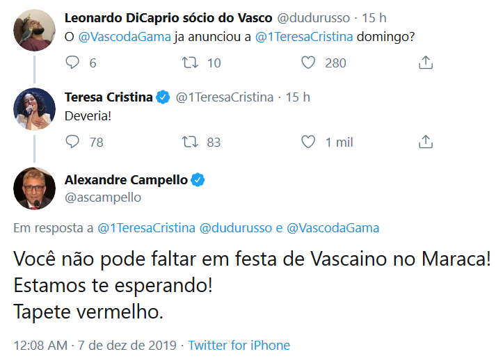 Campello confirma convite à cantora Teresa Cristina: 'Você não pode faltar em festa de vascaíno no Maraca! Estamos te esperando'