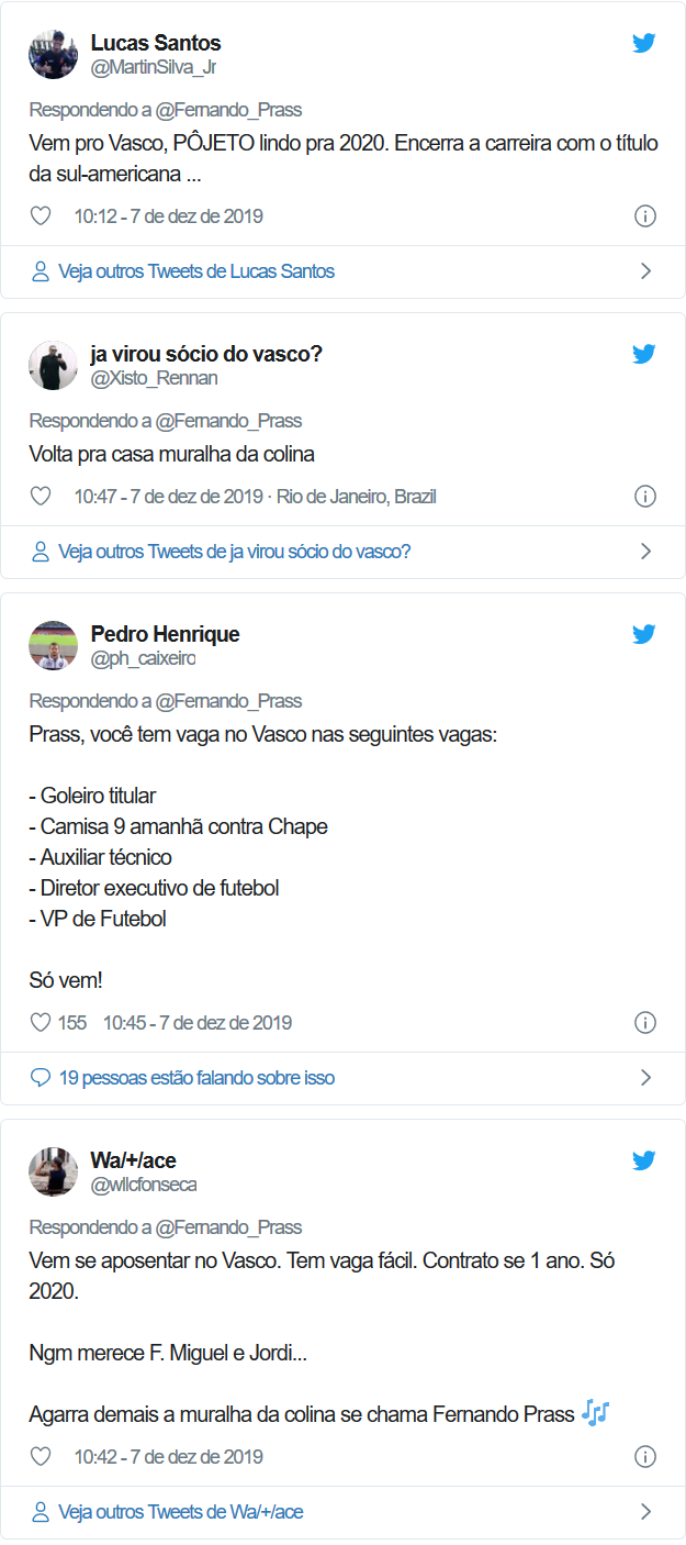 Poucos minutos depois, surgiram diversas mensagens de torcedores pedindo o retorno de Prass ao Vasco, clube em que atuou entre 2009 e 2012.