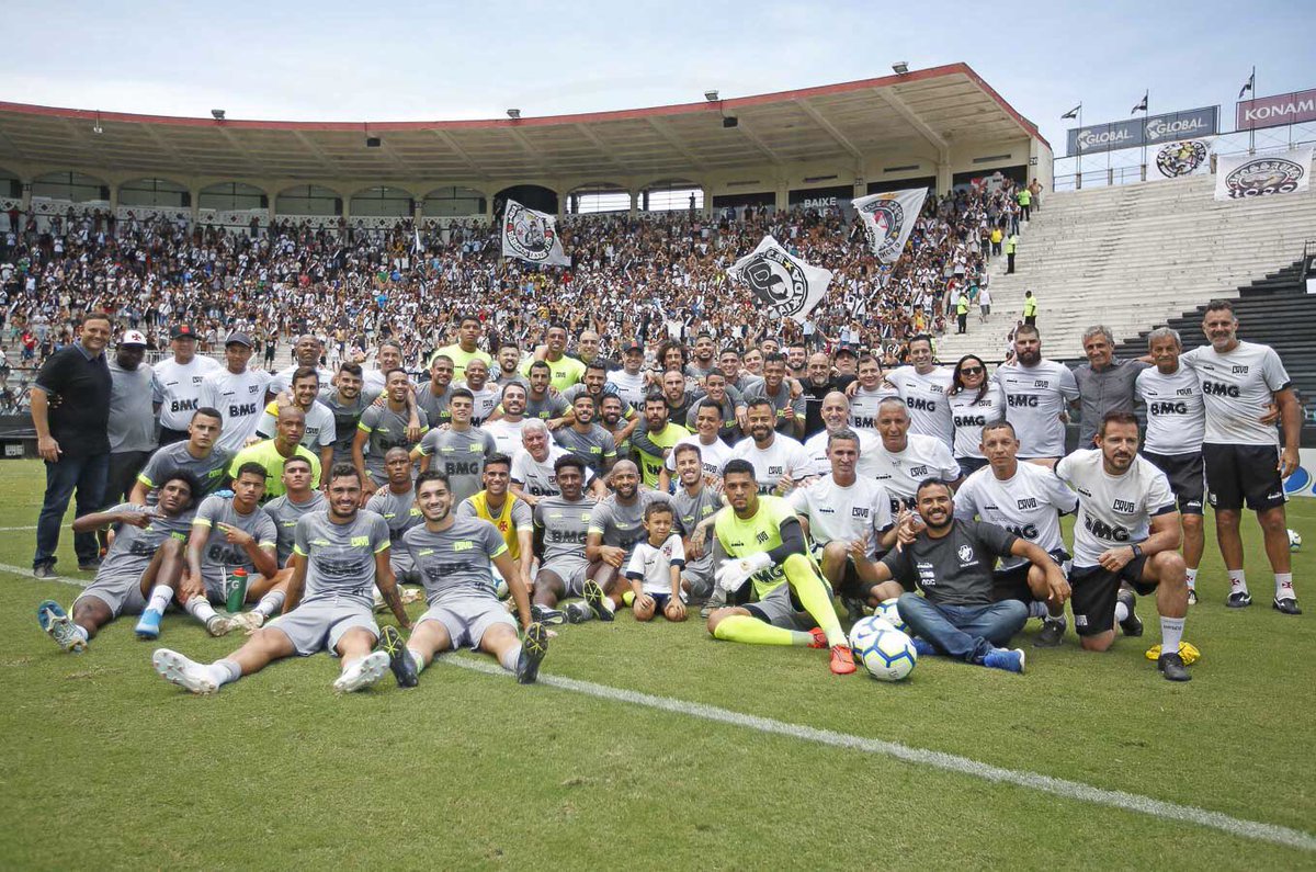 Veja mais uma foto dos jogadores e comissão técnica do Vasco no gramado de São Januário após o treino aberto