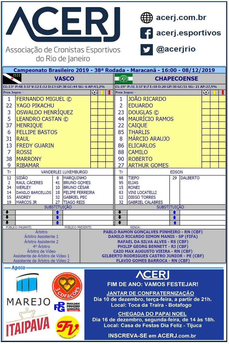 Escalações de Vasco e Chapecoense pela 38ª Rodada do Campeonato Brasileiro 2019 no Maracanã #acerjinforma #VASxCHA #Brasileirão2019