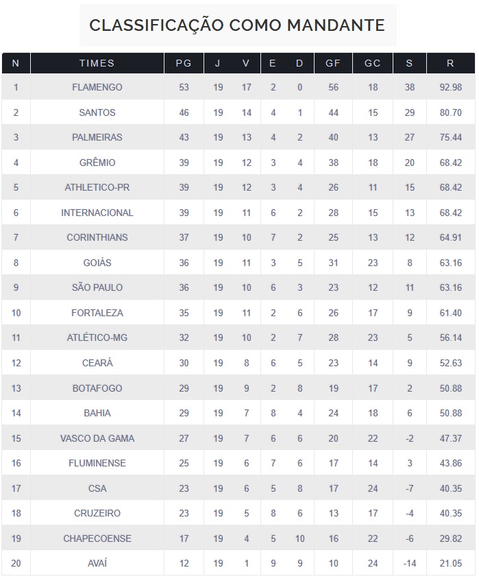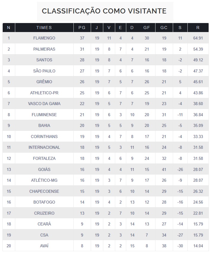 Na comparação com as outras 19 equipes do Brasileiro 2019, o Vasco se saiu muito melhor como visitante do que como mandante. Como visitante, teve a 7ª melhor campanha; como visitante, teve a 15ª melhor campanha, ou seja, a 6ª pior. Veja abaixo.