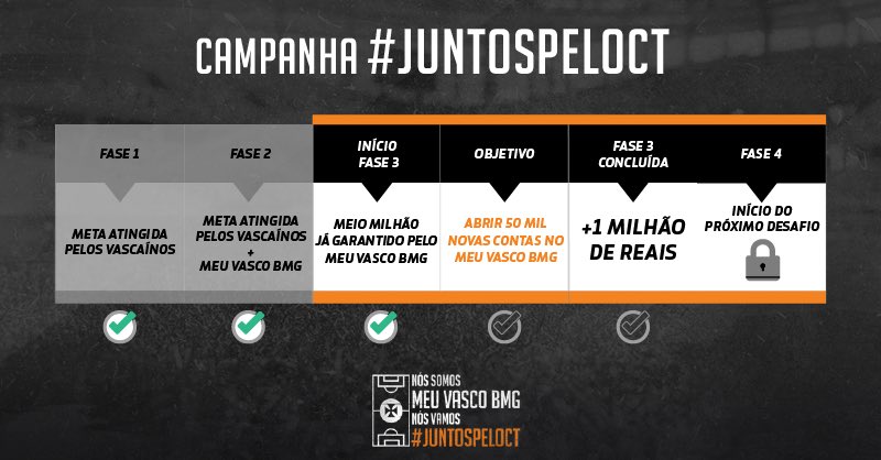A fase 3 do CT já inicia com meio milhão da nossa parte! E o que vem a seguir é com vc, vascaíno: #JuntosPeloCT vamos abrir 50 mil novas contas gratuitas no #MeuVascoBMG!