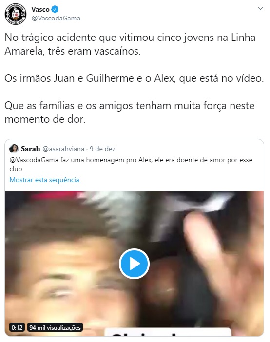 Via Twitter, Vasco homenageia os 3 vascaínos mortos em desastre de carro no domingo