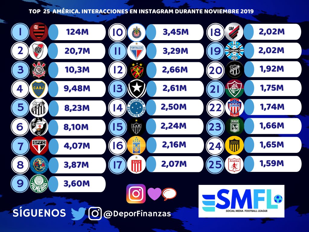 ?⚽ Los 25 clubes de América con más interacciones en #instagram durante noviembre 2019. ??