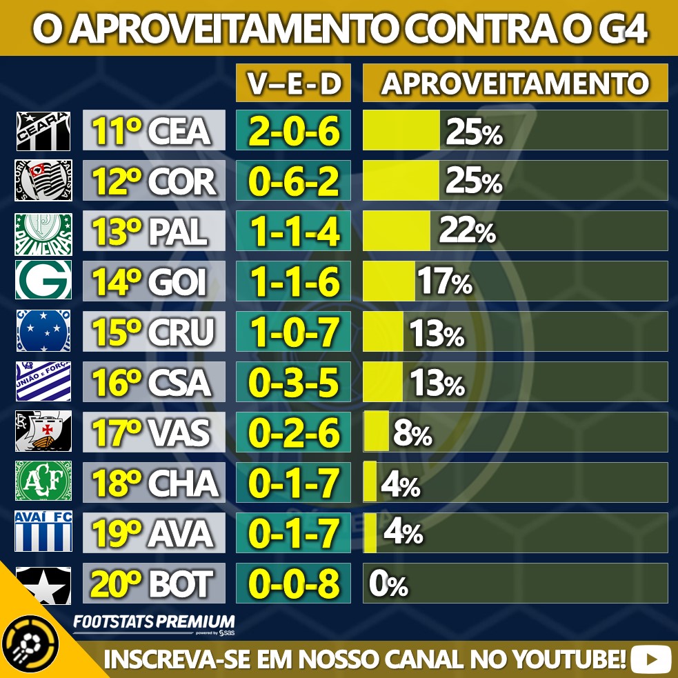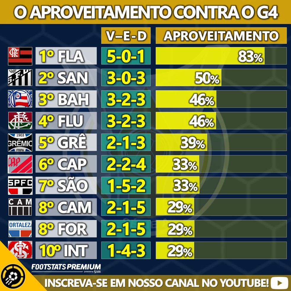 FLAMENGO e SANTOS foram os únicos com aproveitamento de ao menos 50% enfrentando as equipes do G4 no @Brasileirao