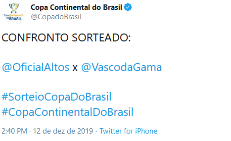 Em rede social, Vasco publica '#PiauiÉVasco' após sorteio da 1ª fase da Copa do Brasil 2020
