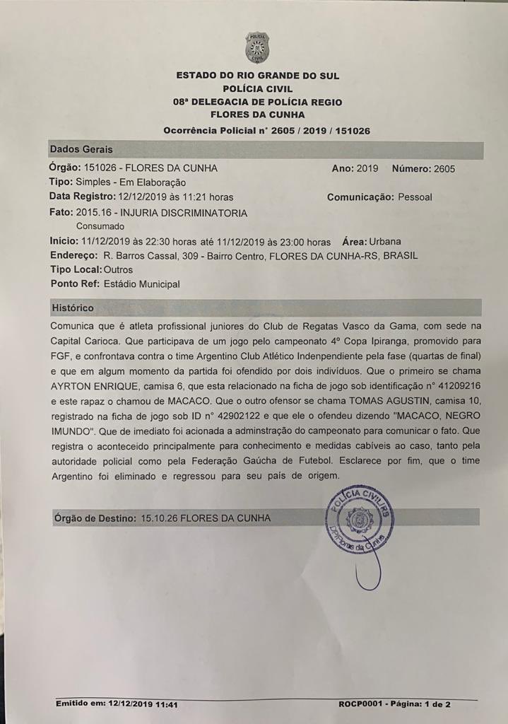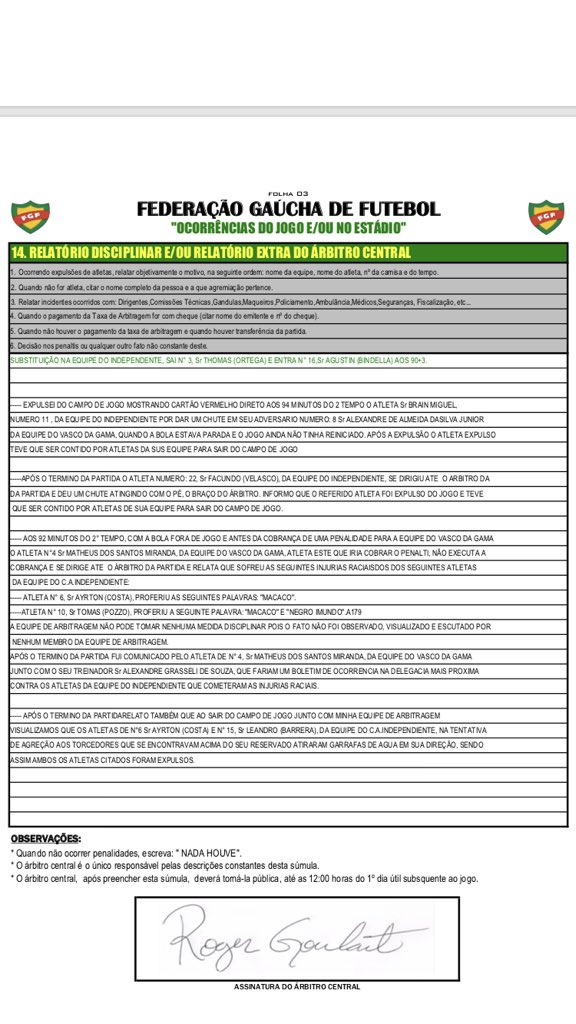 Abaixo, o registro de ocorrência de Miranda na delegacia de Flores da Cunha (RS) e também a súmula da partida