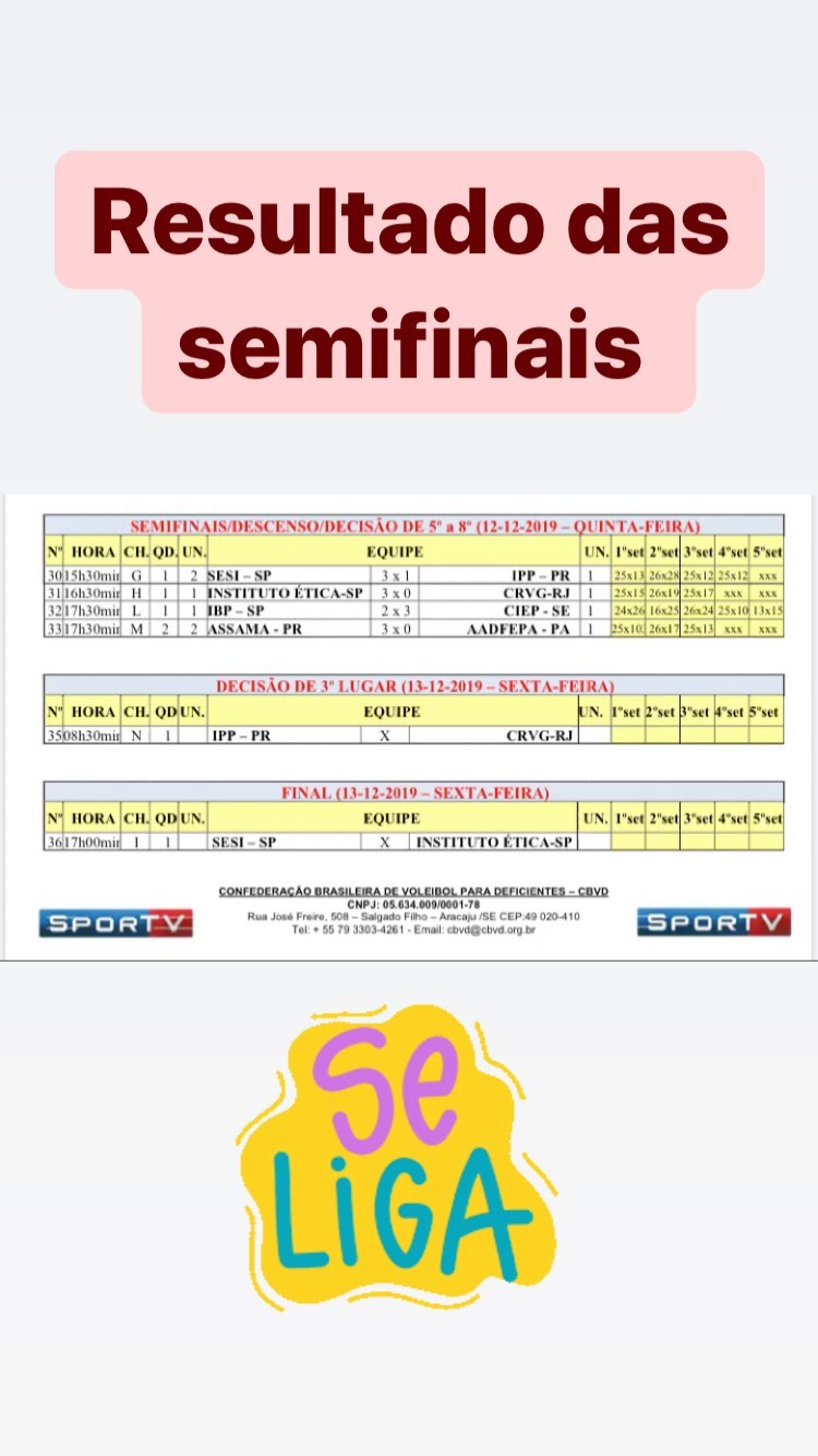 Fonte: CPB (texto), Facebook CBVD (foto), Instagram CBVD (resultados)