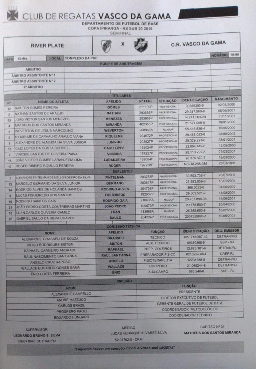 Vasco escalado para enfrentar o River Plate pela semifinal da Copa Ipiranga: Gomes, Nathan, Menezes, Miranda, Riquelme; Weverton, Juninho, Caio Lopes; Vinicius Paiva, João Laranjeira e Roger. TÉC: Alexandre Grasseli.