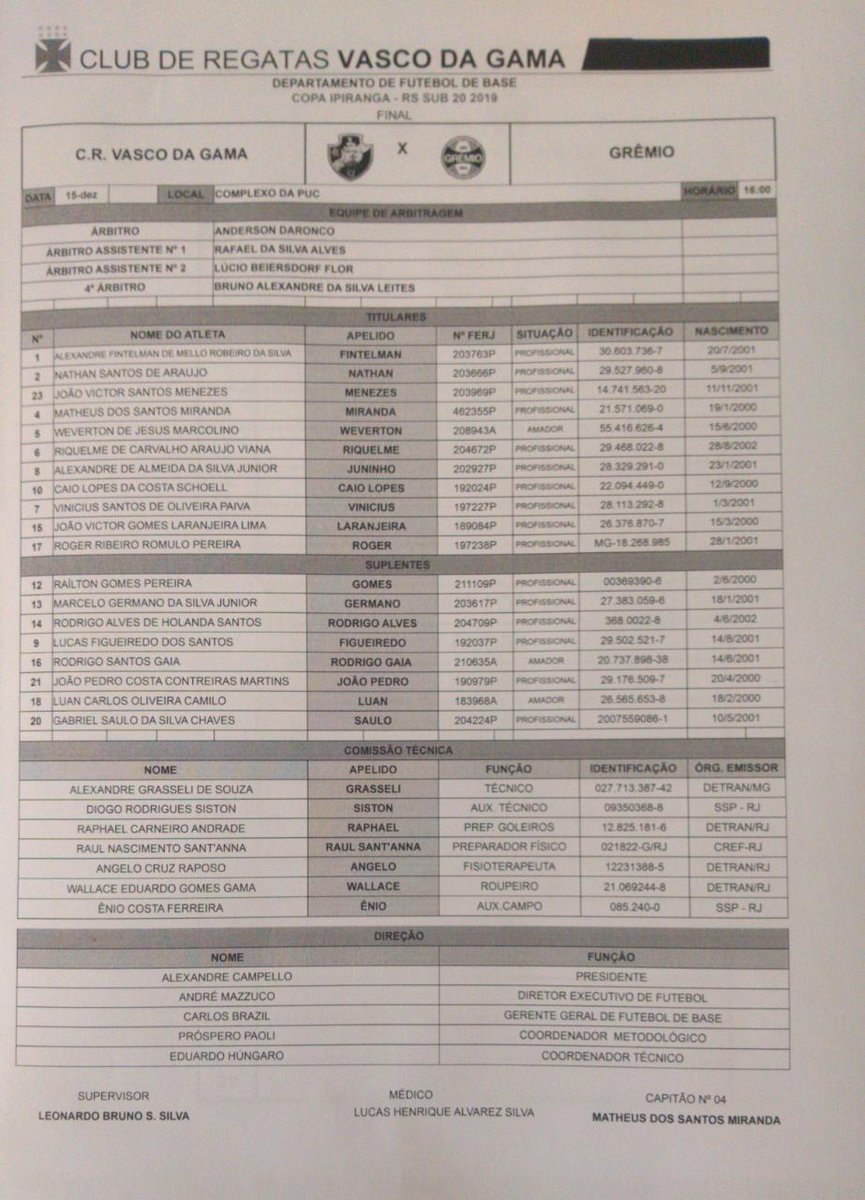 Vasco escalado para a decisão da Copa Ipiranga diante do Grêmio: Fintelman, Nathan, Menezes, Miranda (C), Riquelme; Weverton, Juninho, Caio Lopes; Vinicius Paiva, João Laranjeira e Roger. TÉC: Alexandre Grasseli.