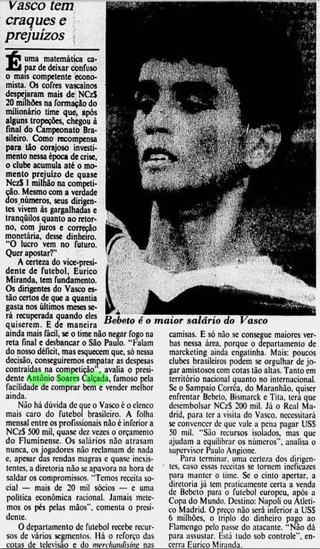 Para ser campeão brasileiro, o Vasco gastou dinheiro. Reportagem do "Jornal do Brasil" do dia da decisão afirmou que o Cruz-maltino, com uma folha salarial de 500 mil cruzados novos, era o clube que mais gastava no país, o equivalente a dez vezes mais que o Fluminense, usado como exemplo. O dinheiro foi usado para bancar medalhões. Bebeto, de acordo com reportagem do dia 28 de dezembro do mesmo ano, recebia 120 mil cruzados novos, 25% da folha total.