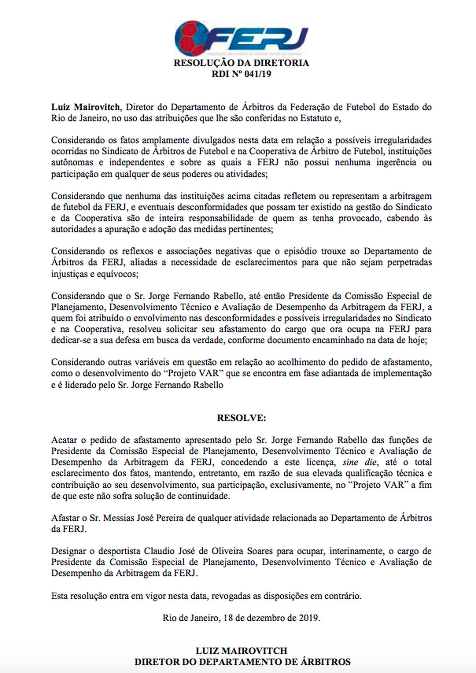 Os dois não quiseram dar declarações à reportagem. No mesmo documento em que acata o pedido de licença de Rabello, Mairovitch afasta Messias de qualquer atividade relacionada ao departamento de árbitros da Ferj.