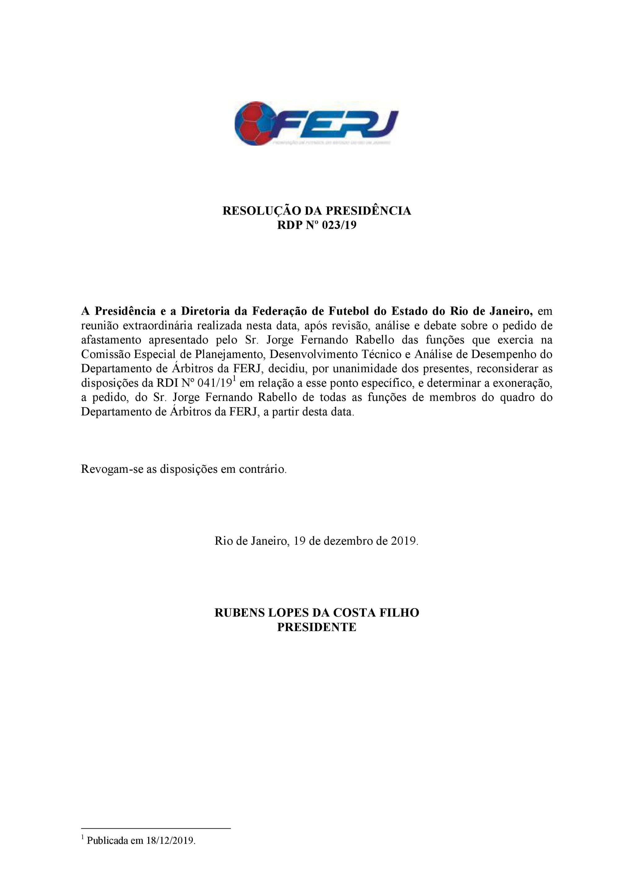 O presidente da Federação de Futebol do Rio de Janeiro, Rubens Lopes, exonerou o ex-chefe de arbitragem da entidade, Jorge Rabello. A decisão foi publicada na noite da última quinta-feira e retira o dirigente "de todas as funções de membros do quadro do Departamento de Árbitros".