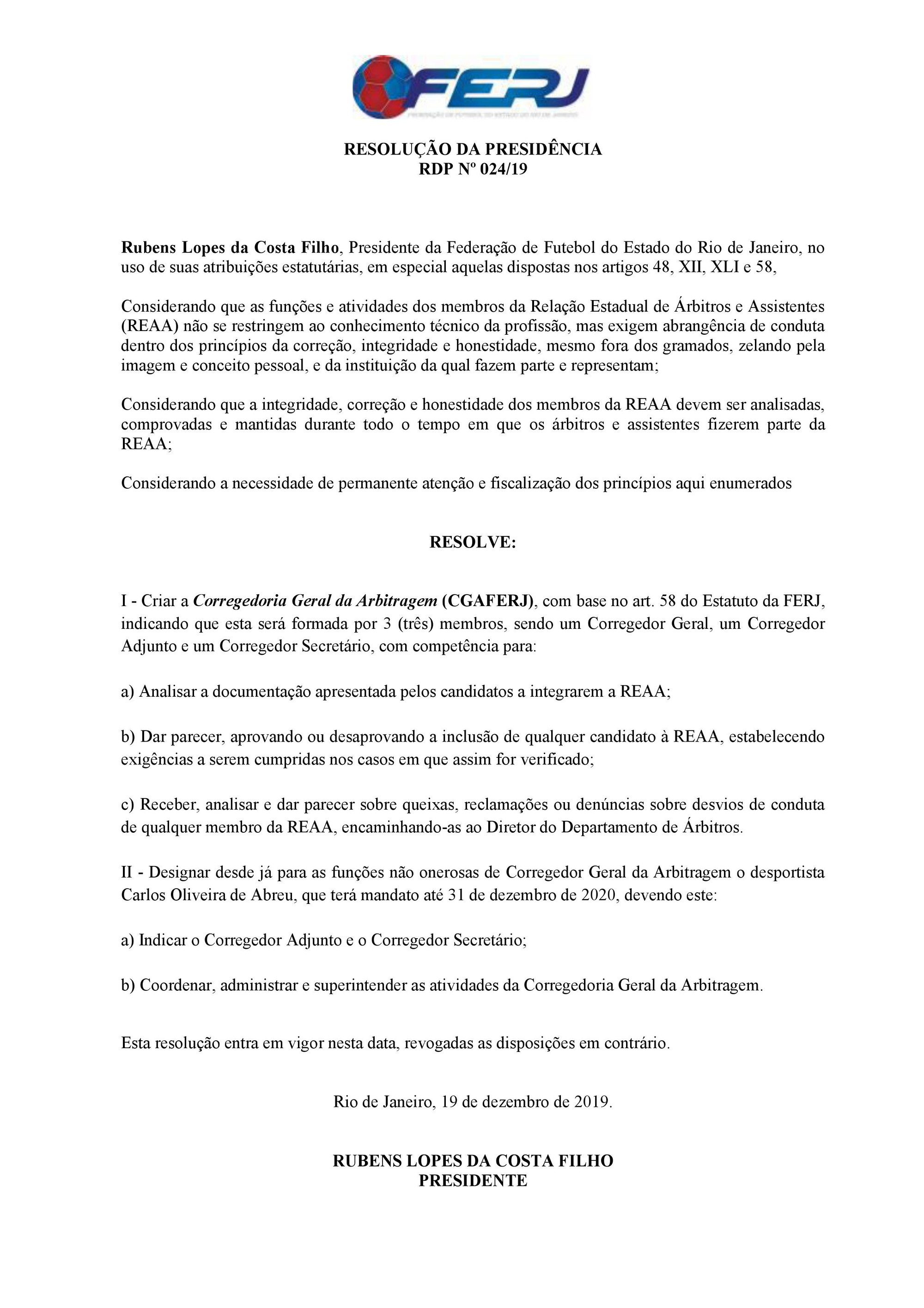 Também nesta quinta, o presidente Rubens Lopes criou a Corregedoria Geral da Arbitragem (CGAFERJ). Segundo o documento, a nova entidade servirá, principalmente, para "Receber, analisar e dar parecer sobre queixas, reclamações ou denúncias sobre desvios de conduta de qualquer membro da Relação Estadual de Árbitros e Assistentes".