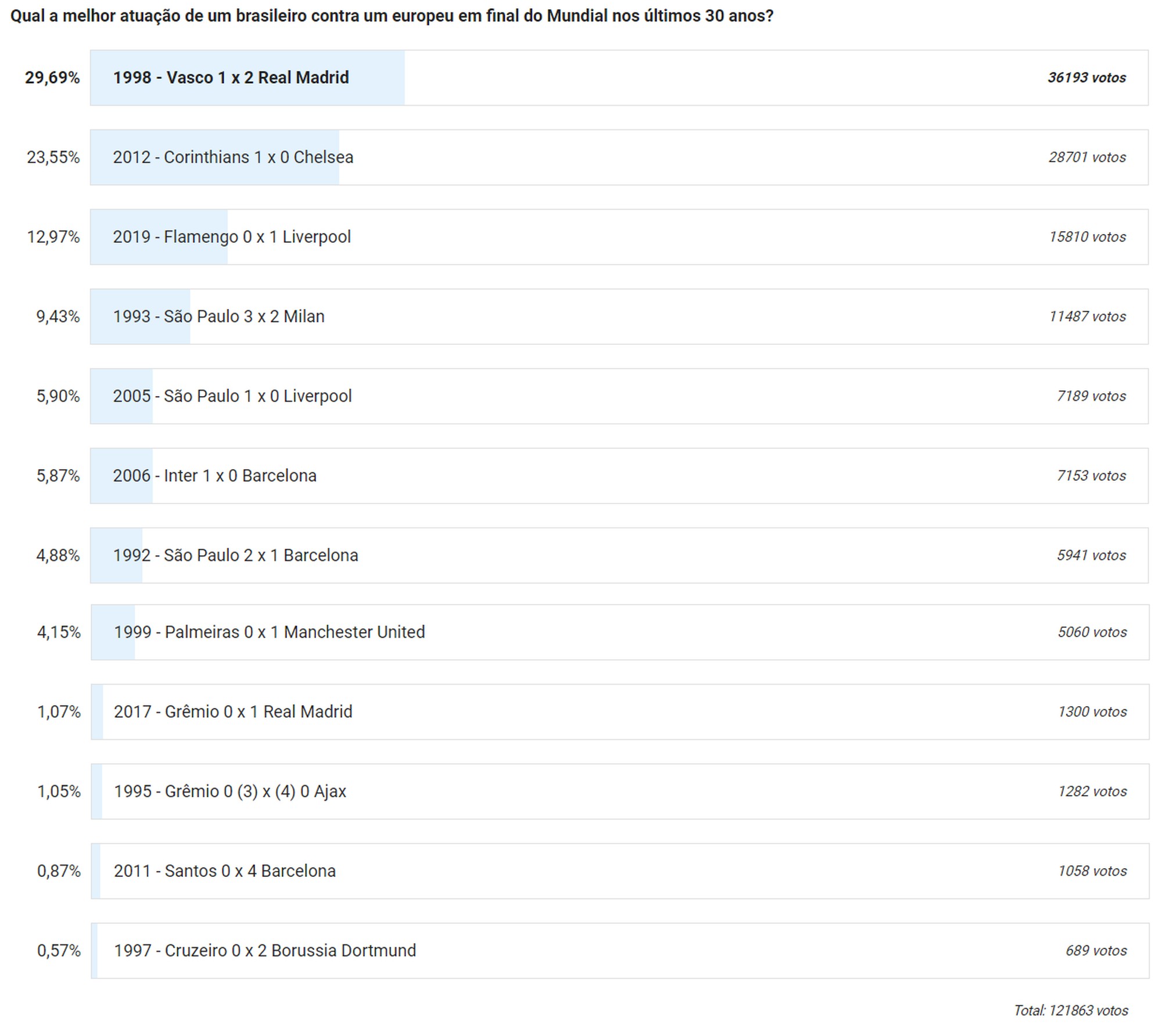 Ao todo, a enquete contou com 121.863 votos. E 29,69% deles foram para a atuação do Vasco contra o Real Madrid. Em segundo lugar ficou a vitória do Corinthians sobre o Chelsea no título de 2012, o último de uma equipe sul-americana, com 23,55% dos votos.