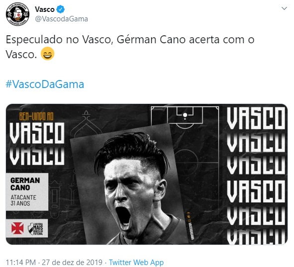27/12/19 - Germán Cano, no Instagram: 'Obrigado Vasco da Gama por confiar em mim. Estou muito feliz'
