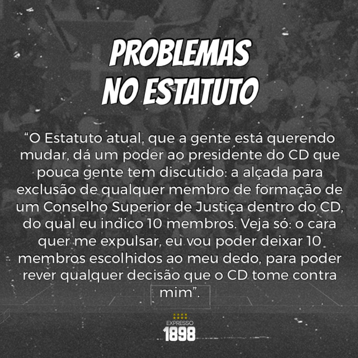 "Uma crítica é que a gente está dando muito poder ao presidente do CD. Ao contrário, a gente está tirando poder do Executivo. Não é para engessar, mas evitar a perpetuação apenas pelo poder. Não cito personagens históricos do clube para não parecer ofensivo".