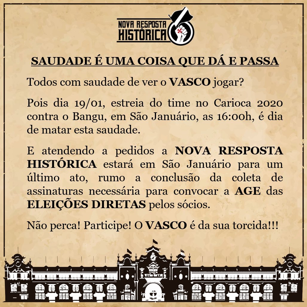 A NOVA RESPOSTA HISTÓRICA informa que estará presente em São Januário para VASCO x Bangu, dia 19/01, as 16:00h.