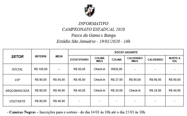 Gratuidade poderá ser retirada APENAS EM SÃO JANUÁRIO NO SETOR ARQUIBANCADA: a retirada da gratuidade estará disponível nos dias 16, 17 e 18 de janeiro, na bilheteria 11 de São Januário, mediante apresentação do CPF e RG original ou cópia autenticada.