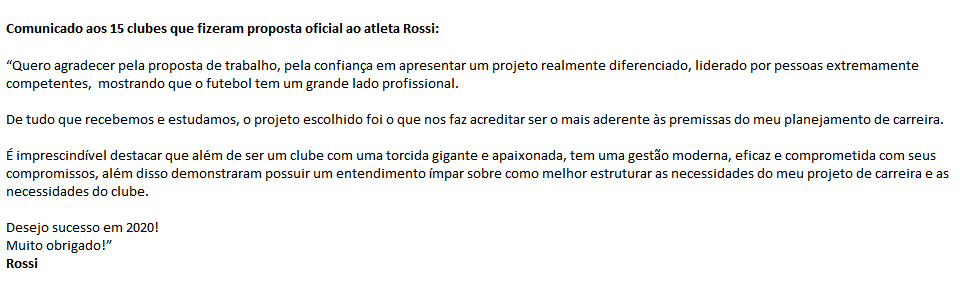 Rossi enviou agradecimento aos presidentes dos 15 clubes que lhe fizeram propostas
