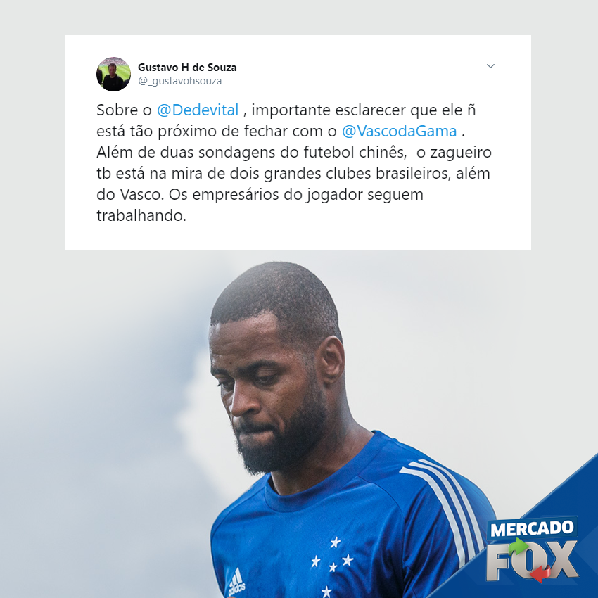 Sobre o @Dedevital , importante esclarecer que ele ñ está tão próximo de fechar com o @VascodaGama . Além de duas sondagens do futebol chinês, o zagueiro tb está na mira de dois grandes clubes brasileiros, além do Vasco. Os empresários do jogador seguem trabalhando.