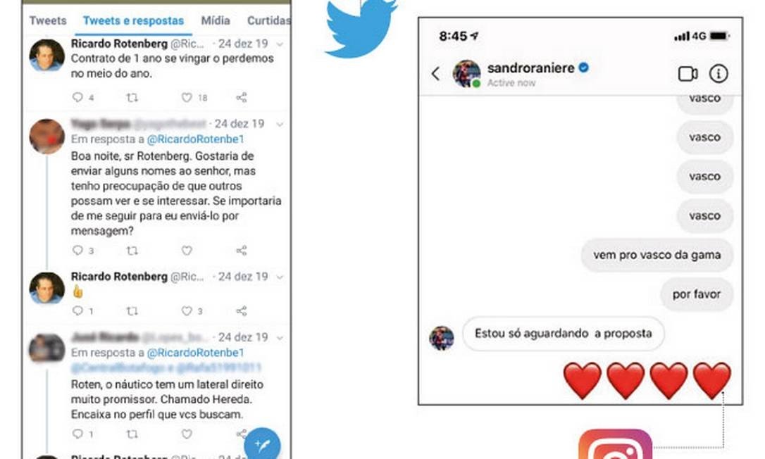 Existe ainda o torcedor que resolve ir mais longe e fazer a ponte entre jogador e clube. Wallace Neguere é vascaíno. De uns tempos para cá, o empresário de 39 anos, morador de Brasília, ganhou fama no Twitter com os vídeos que faz sobre o Vasco, muitas vezes interagindo com o filho. Diante da necessidade de o clube contratar um volante, ele entrou em contato com Sandro, ex-jogador da seleção, que está livre no mercado. Depois da insistência no Instragram, recebeu uma resposta: "Estou só aguardando a proposta".