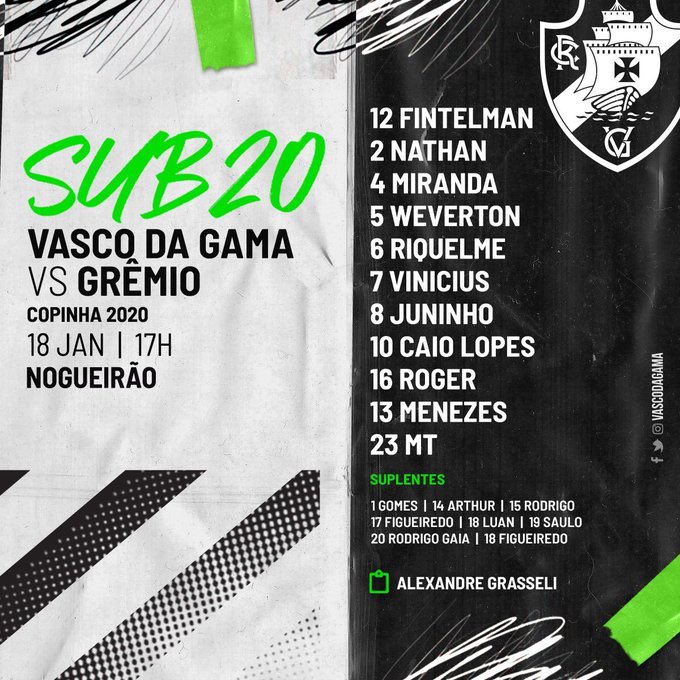 Vasco escalado para enfrentar o Grêmio, em Mogi das Cruzes, às 17h pela as quartas de final da Copa SP: Fintelman, Nathan, Menezes, Miranda (C) e Riquelme; Weverton, Juninho e Caio Lopes; Vinicius Paiva, Roger e MT; Técnico: Alexandre Grasseli.