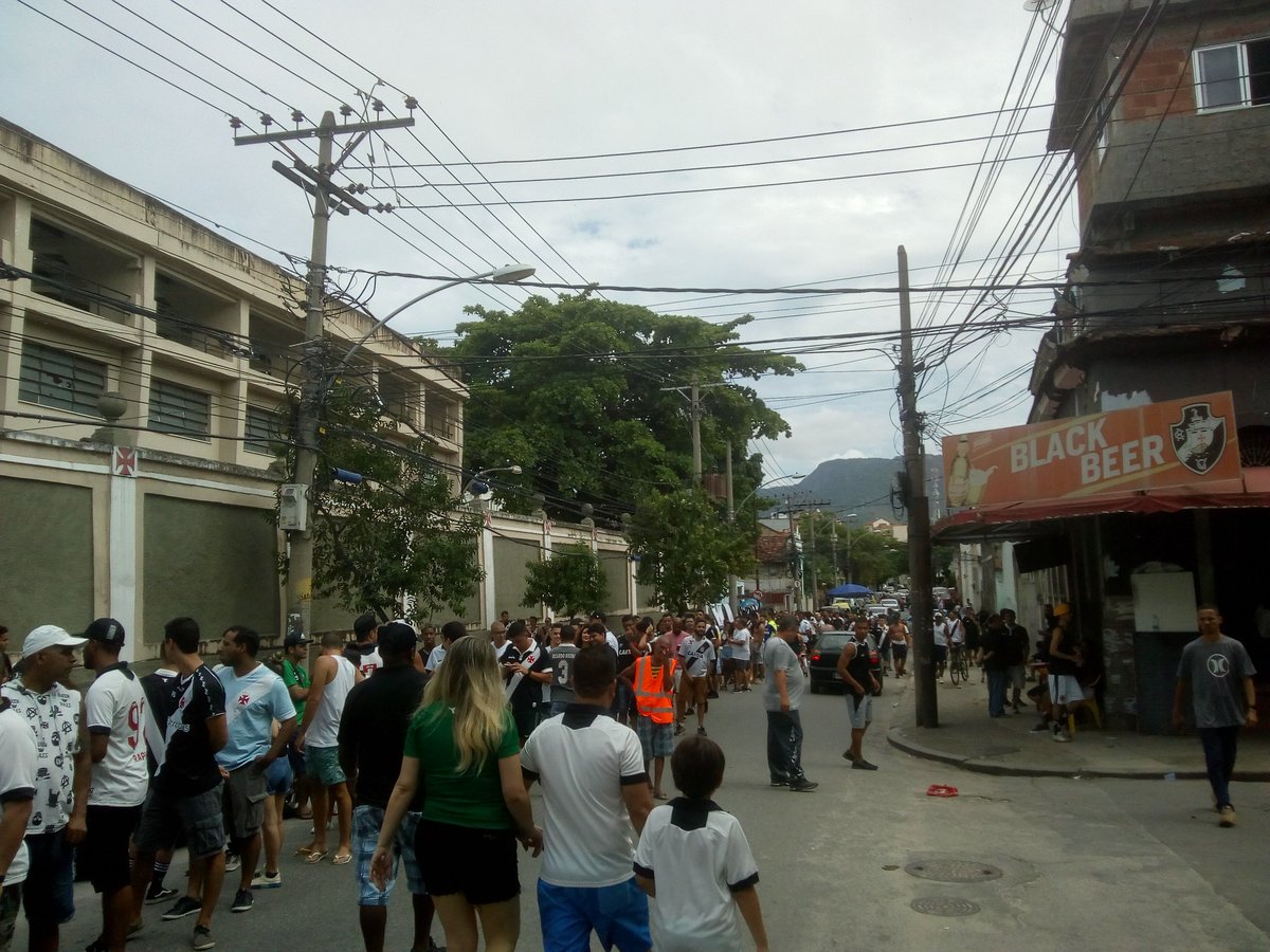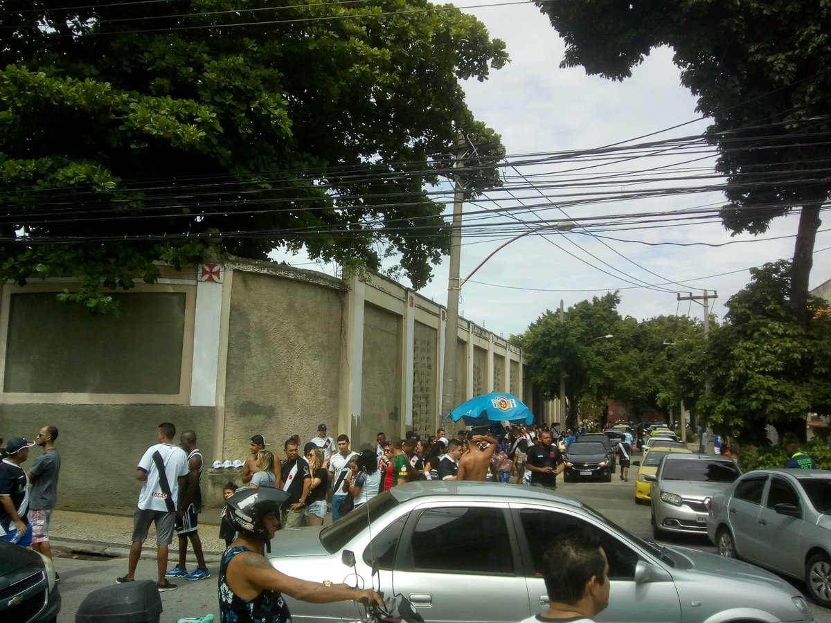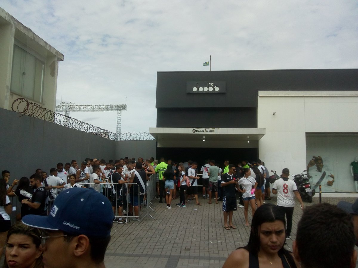 Os sócios que não conseguiram realizar o check-in enfrentam uma grande fila, que dobra a esquina, para retirar os ingressos. #lanceCOLINA