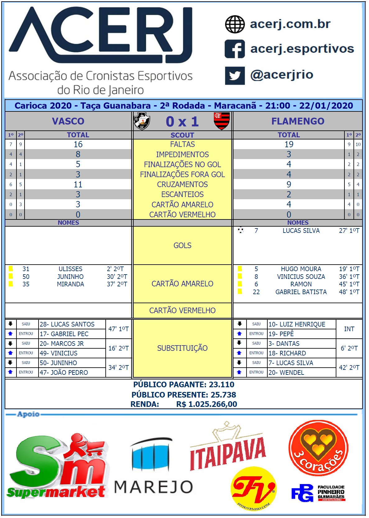 O Vasco começou melhor a partida e chegou a abrir o placar, com Ribamar, mas o gol foi anulado pelo VAR. O Flamengo melhorou aos poucos e marcou com Lucas Silva. No segundo tempo, os rubro-negros souberam administrar o resultado para sair de campo com a vitória.