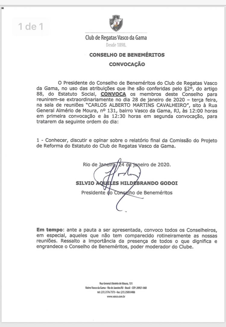 Conselho de Beneméritos do Vasco convoca reunião para o próximo dia 28 com o propósito de "conhecer, discutir e opinar sobre o relatório final da comissão do projeto de reforma do estatuto"