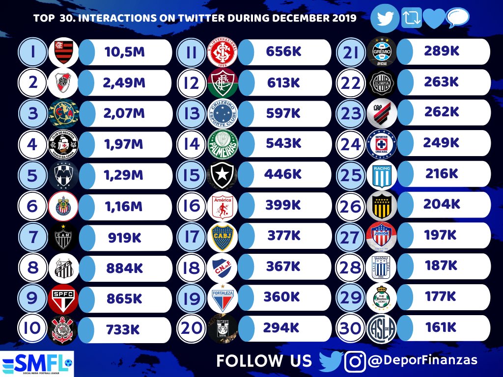 ⚽? Los 30 clubes de América con más interacciones en #twitter durante diciembre 2019. ???