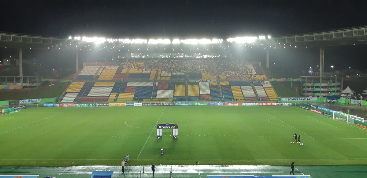 Público acanhado no Kleber Andrade, na noite deste sábado. A chuva que atinge o Espírito Santo, há mais de uma semana, pode ter afastado o torcedor do estádio #trcariacica